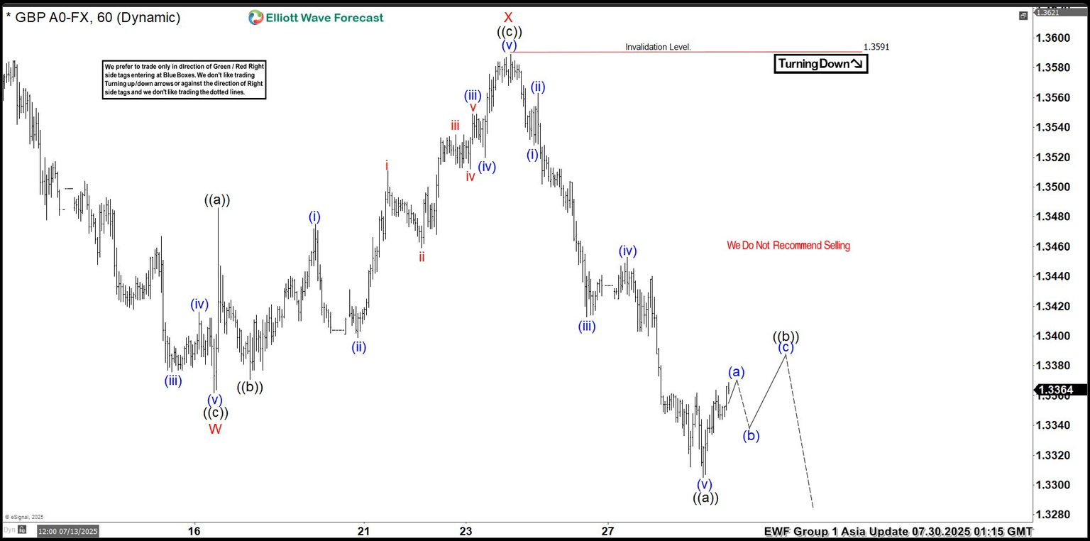 The GBPUSD is trading in higher high sequence from 9.22.2022 low in weekly. The bounce is corrective Elliott Wave sequence & expect further upside. It favors pullback in proposed 7 swings from 7.01.2025 high & extend into 1.3162 – 1.2898 area, while below 7.23.2025 high. It should find buyers in to extreme area for next leg higher in daily or at least 3 swings bounce. In 4-hour, it started correcting lower from 7.01.2025 high. It ended W at 1.3362 low of 7.16.2025 & X at 1.3589 high of 7.23.2025 each in 3 swings. Below X high, it favors downside in Y in 3 swings as it broke below 7.16.2025 low, expecting into extreme area. Within W, it ended ((a)) at 1.3523 low, ((b)) at 1.3620 high & ((c)) at 1.3362 low. Above there, it placed ((a)) at 1.3486 high, ((b)) at 1.3371 low & ((c)) as X connector at 1.3589 high. The double correction unfolds in 3-3-3 structure, which will complete, when current bounce fails below 7.23.2025 high to new low into extreme area. It ended ((a)) of Y into 0.618 – 0.764 Fibonacci extension area of W & expect 3 or 7 swings bounce in ((b)).