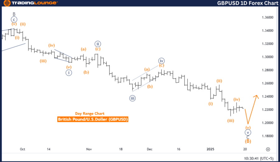 The GBPUSD daily chart reflects a counter-trend phase based on Elliott Wave Analysis. The current wave configuration exhibits an impulsive structure, focusing on orange wave five, which is part of a broader corrective sequence. This phase represents navy blue wave five of C, the concluding segment of the ongoing correction.