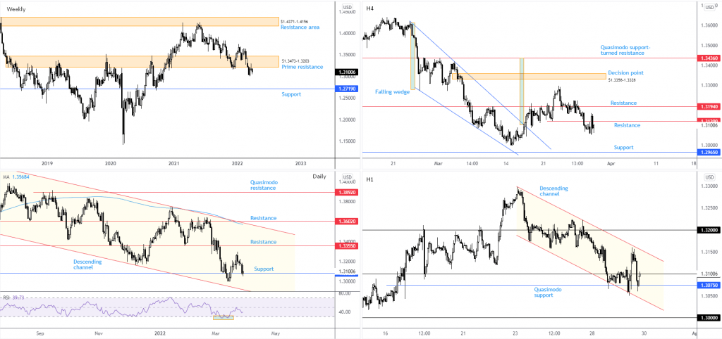 Not only is the trend to likely weigh on upside efforts, prime resistance is a focal point on the weekly timeframe at $1.3473-1.3203 with the chart demonstrating scope to drop as far south as weekly support from $1.2719. Trend direction has been southbound since late 2007 tops at $2.1161. As a result, the 25 percent move from pandemic lows in March 2020 to February 2021 might be viewed as a pullback within the larger downtrend. This, of course, places a question mark on the 8.5 percent ‘correction’ from February 2021 to March 2022, suggesting the possibility of continuation selling.