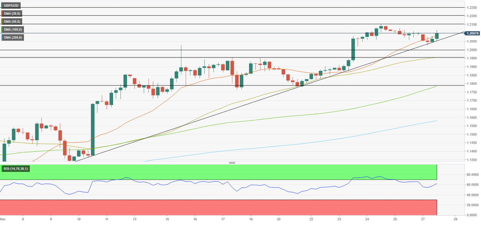 GBP/USD dropped toward the ascending trend line coming from November 9 but managed to hold above it. Additionally, the pair returned above the 20-period Simple Moving Average (SMA) after making a four-hour close below it earlier in the day, highlighting the lack of sellers' interest.