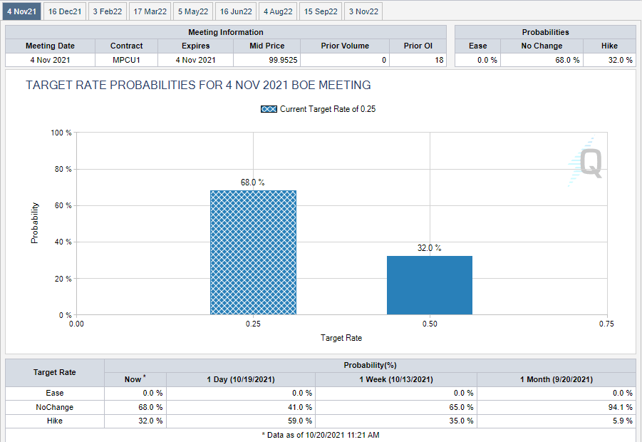 - Odds of a BoE rate hike in November declined to 32% from 59%.