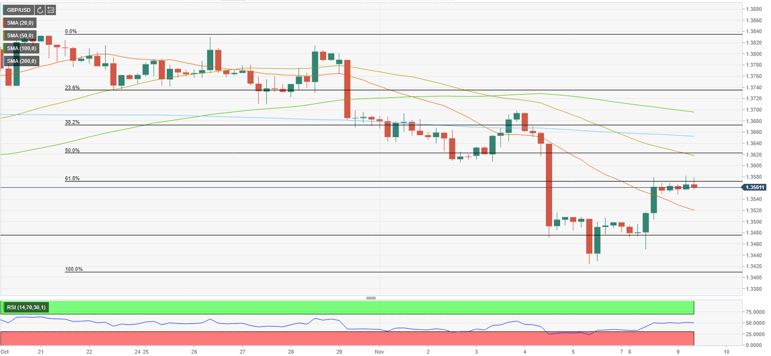 In case GBP/USD climbs above 1.3570 and confirms it as support, it could target 1.3630 /Fibonacci 50% retracement, 50-period SMA) and 1.3660 (200-period SMA).