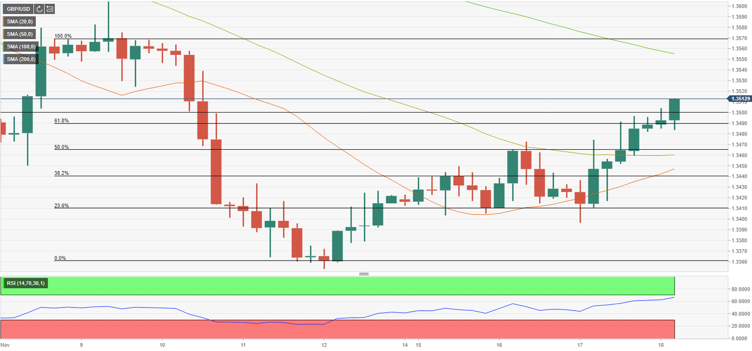 As of writing, the pair is trading above 1.3500 - the Fibonacci 61.8% retracement of the downtrend witnessed following the BoE's decision to leave its policy rate unchanged earlier in the month. In case buyers manage to continue to defend this level, GBP/USD could continue to push higher toward 1.3550 (100-period SMA) and 1.3570 (static level).