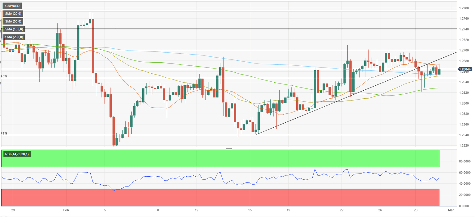 GBP/USD holds above 1.2650, where the Fibonacci 23.6% retracement of the long-term uptrend and the 200-period Simple Moving Average (SMA) on the 4-hour chart align. If the pair drops below that level and confirms it as resistance, technical sellers could take action. In this scenario, 1.2630 (100-period SMA) could act as interim support before 1.2600 (psychological level, static level).