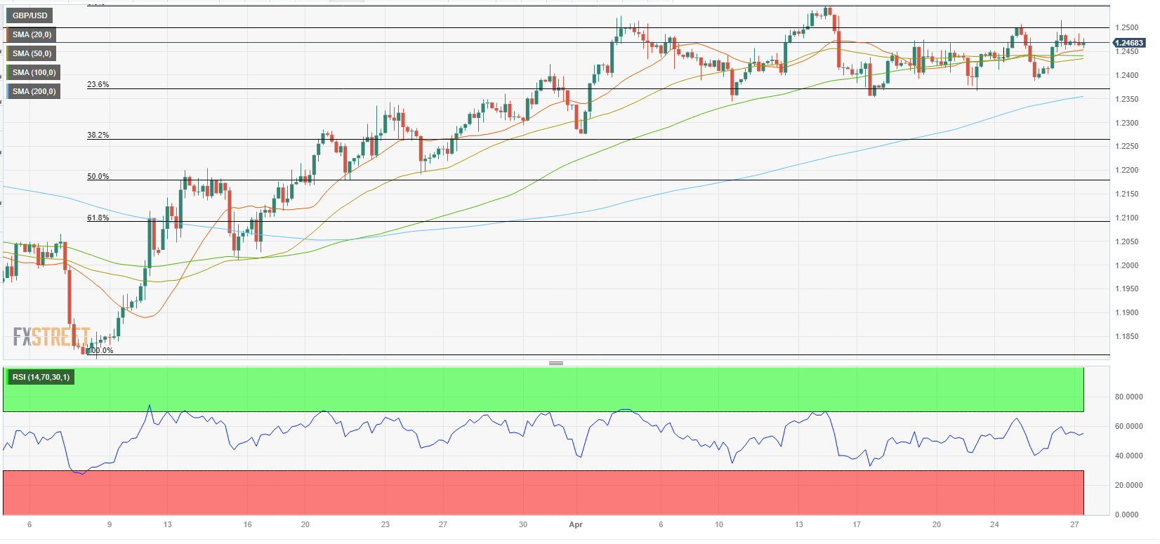 GBP/USD trades above the 1.2440/1.2450 support area, where the 20-period, 50-period and 100-period Simple Moving Averages on the four-hour chart are located. Additionally, the Relative Strength Index (RSI) indicator stays above 50 despite the latest pullback, confirming the bullish bias.
