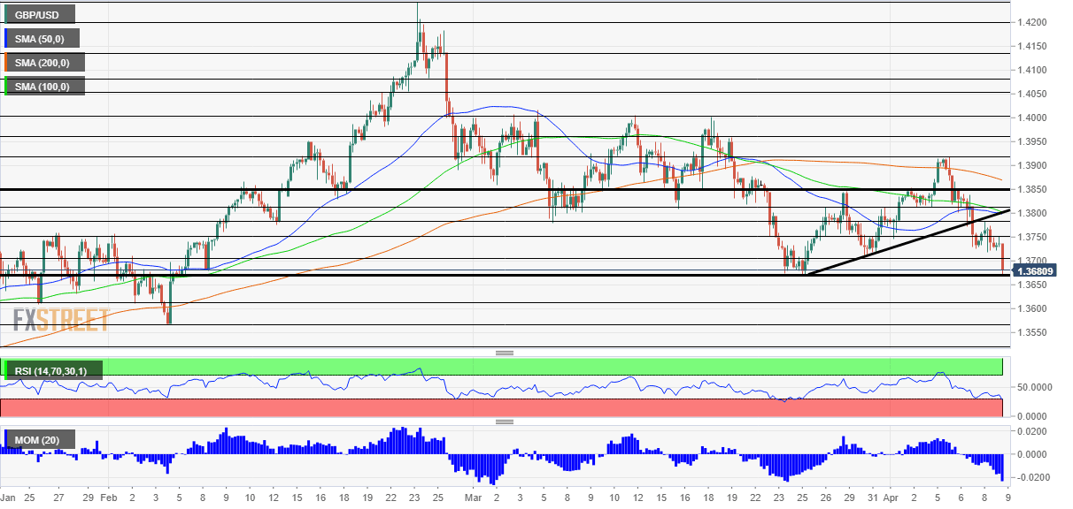 Pound/dollar has been extending its falls after breaking below the uptrend support line, as the four-hour chart is showing. Momentum remains to the downside and the Relative Strength Index is above the 30 level, outside oversold territory.