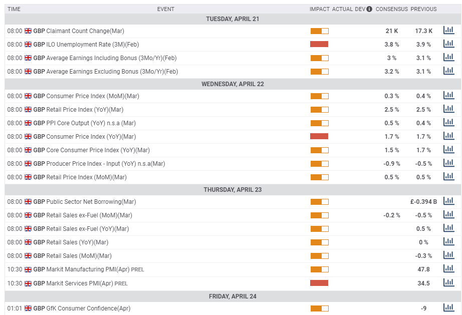 The calendar is packed on Thursday, with Retail Sales data for March kicking off the day. It will likely show significant falls on all measures, apart from groceries. While the lockdown began only on March 23, a drop in consumption may already be seen now. Public Sector Net Borrowing is also of interest and could show how public debt has already begun rising in response to the crisis.