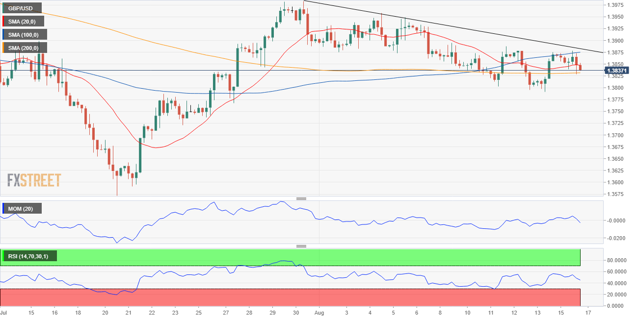 The GBP/USD pair is held below a daily descendant trend line coming from July’s high at 1.3983 and remains neutral in the near-term. The 4-hour chart shows that it is trading mid-way between directionless 100 and 200 SMAs while hovering around an also flat 20 SMA. Additionally, technical indicators hover around their midlines without directional strength. The mentioned trend line is currently at 1.3880, providing immediate resistance.