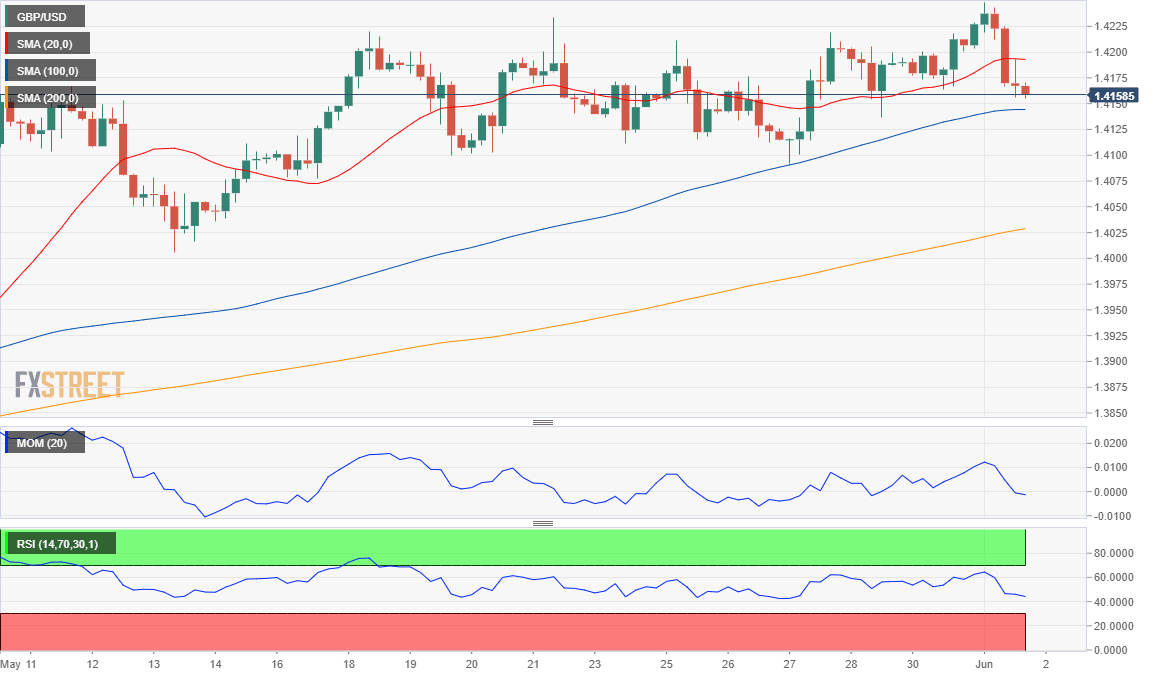 The GBP/USD pair is pressuring the daily low heading into the Asian opening, a sign of further slides ahead. The 4-hour chart shows that it has broken below a bullish 20 SMA, now providing dynamic resistance at 1.4190, and approaching an also bullish 100 SMA, the latter at 1.4140. The Momentum indicator advances within neutral levels, but the RSI is stable around 45, indicating constant selling pressure.