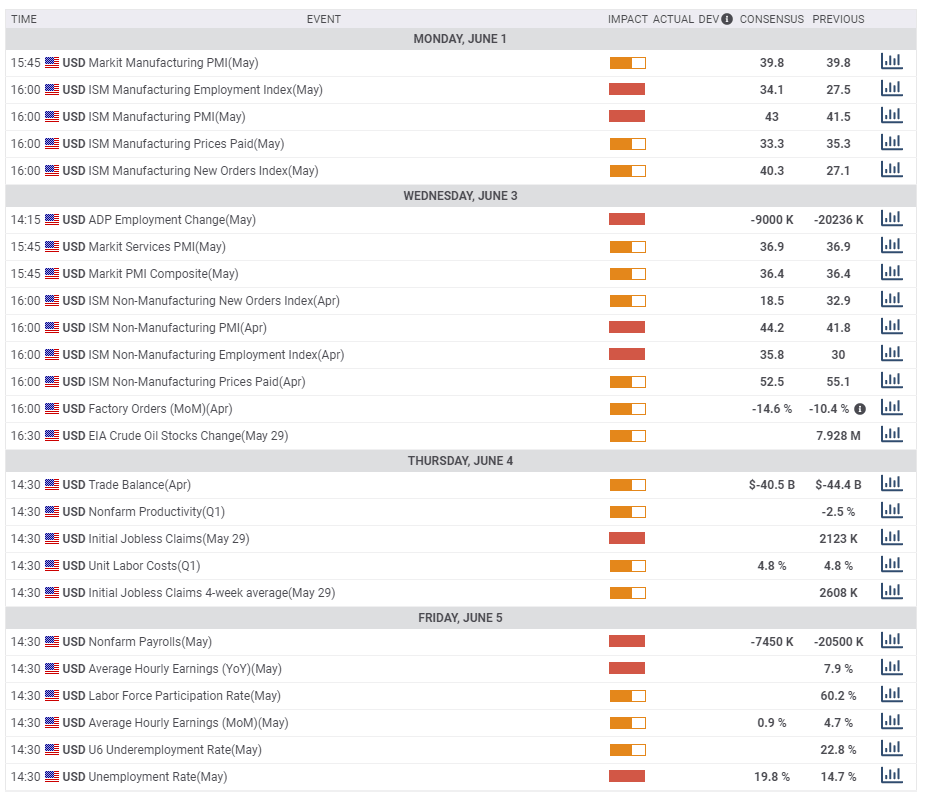 The economic calendar is packed and revolves around Friday's Non-Farm Payrolls report. The buildup kicks off on Monday, with the ISM Manufacturing Purchasing Managers' Index. The forward-looking indicator and its employment component will likely show a bounce from the lows but remain below the 50-point mark separating expansion from contraction.