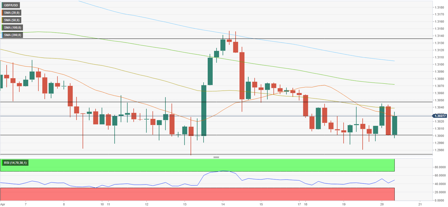 On the downside, 1.3000 (psychological level, static level) aligns as key support. A daily close below that level could bring in sellers and cause the pair to fall toward 1.2970 (April 13 low) and 1.2920 (static level).