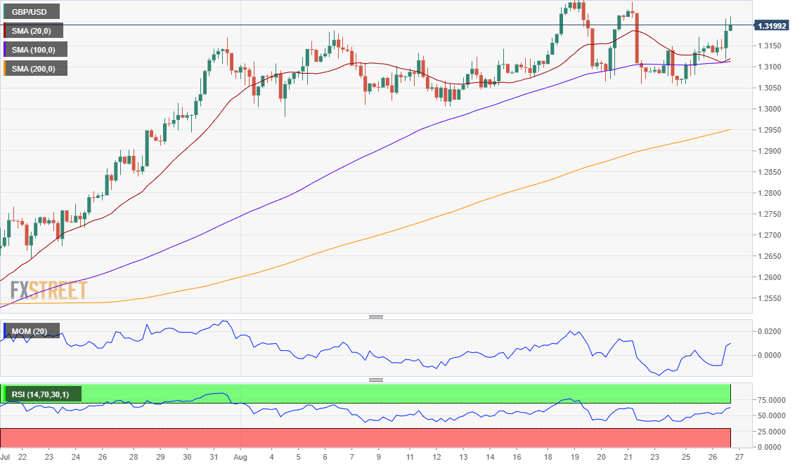 The GBP/USD is up for a second consecutive day, trading around the 1.3200 level by the end of the US session. The pair surged from a daily low at 1.3116, reached after the release of encouraging US data, which anyway was not enough to support the dollar. The advance seems linked to investor’s cautious approach to the greenback ahead of Fed’s Powell speech on Thursday rather to resurgent demand for the sterling.