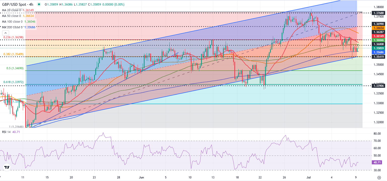 The 100-period Simple Moving Average (SMA) on the 4-hour chart aligns as a pivot level at 1.3600. In case GBP/USD confirms that level as resistance, 1.3570 (200-period SMA) could be seen as the next support level before 1.3540 (lower limit of the ascending channel, Fibonacci 38.2% retracement of the latest uptrend) and 1.3500 (static level, round level).