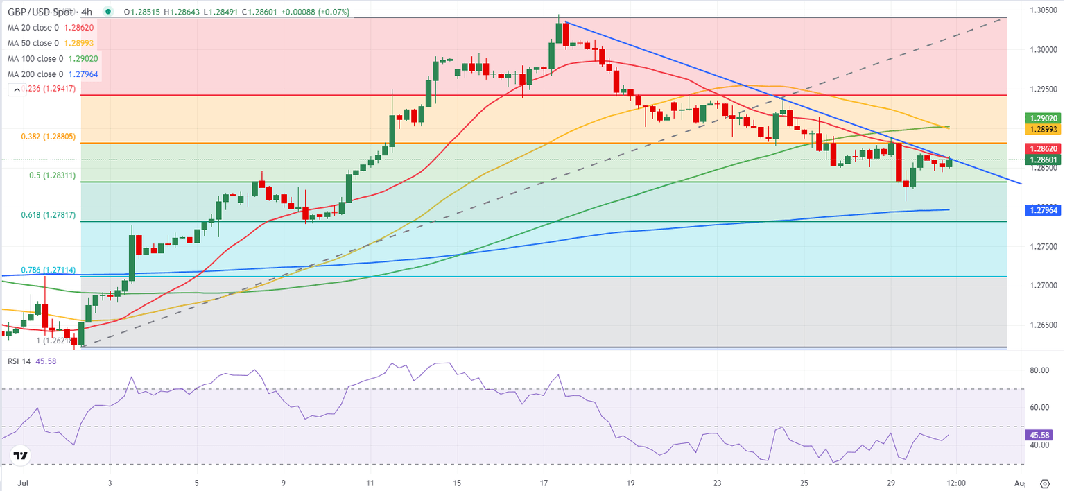 GBP/USD stays slightly below the descending trend line, currently located at 1.2860, and the Relative Strength Index (RSI) indicator on the 4-hour chart stays slightly below 50, reflecting a lack of buyer interest.