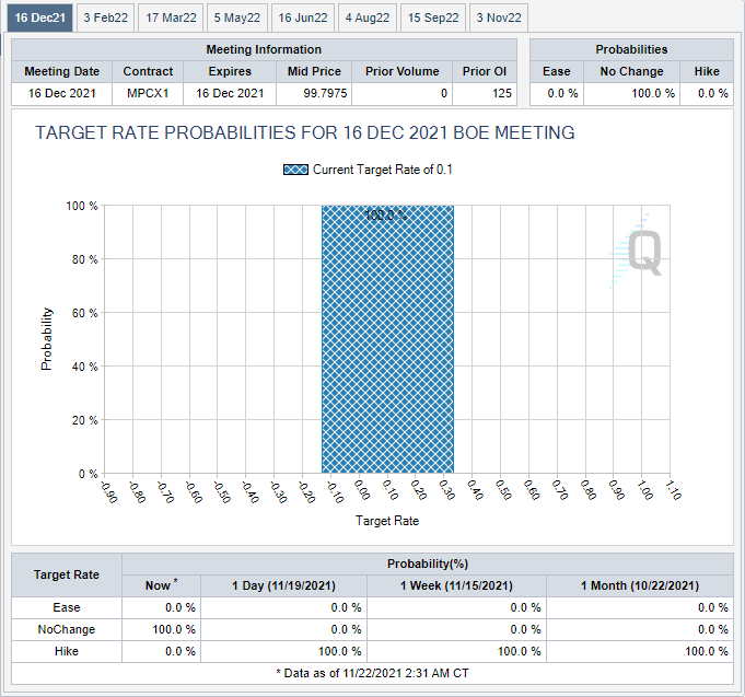 - Money markets fully price in a 20 bps BoE hike in December.