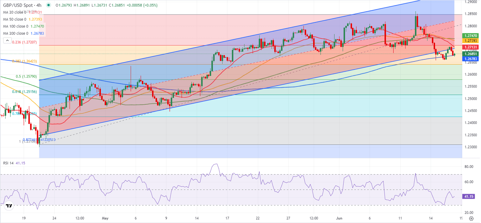 GBP/USD stays below the lower limit of the ascending regression channel and the Relative Strength Index on the 4-hour chart remains well below 50, reflecting the bearish bias. On the downside, 1.2640 (Fibonacci 38.2% retracement of the latest uptrend) aligns as key support ahead of 1.2600 (psychological level, static level) and 1.2580 (Fibonacci 50% retracement).
