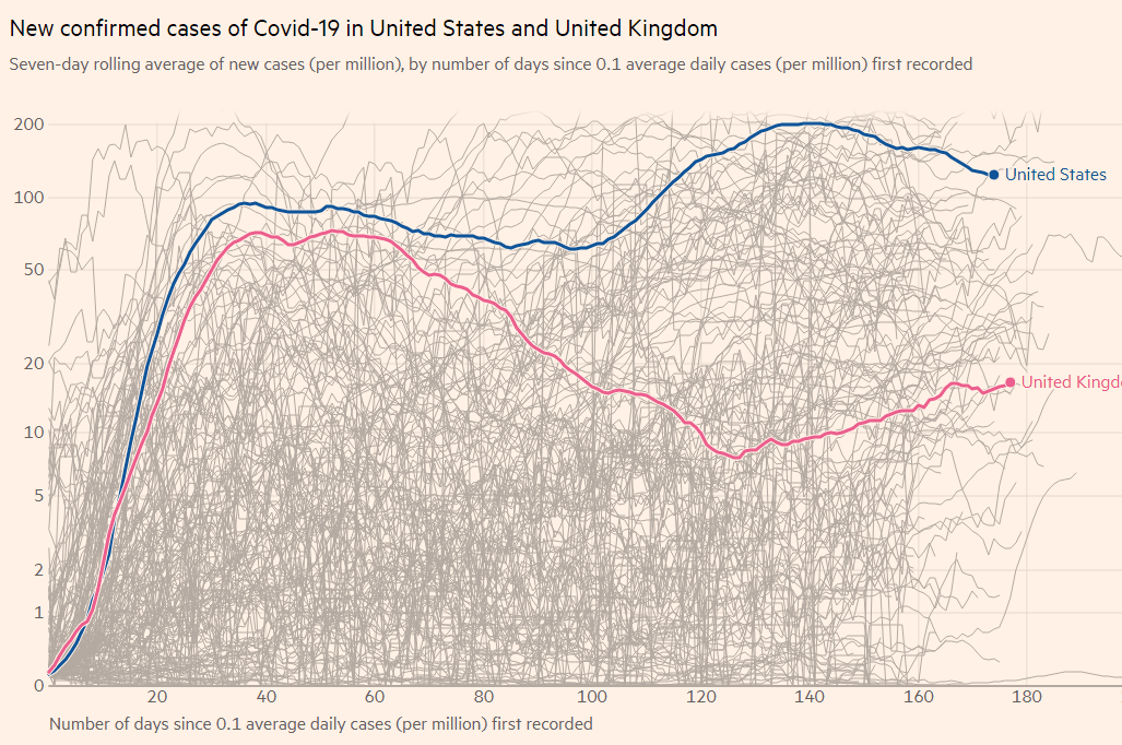 Another reason for concern is the increase in coronavirus cases in the UK, just as the school year begins. Authorities are scrambling to reopen schools safely, and the task has become harder amid an increase in infections. That compares with a gradual decrease in America's COVID-19 curve.
