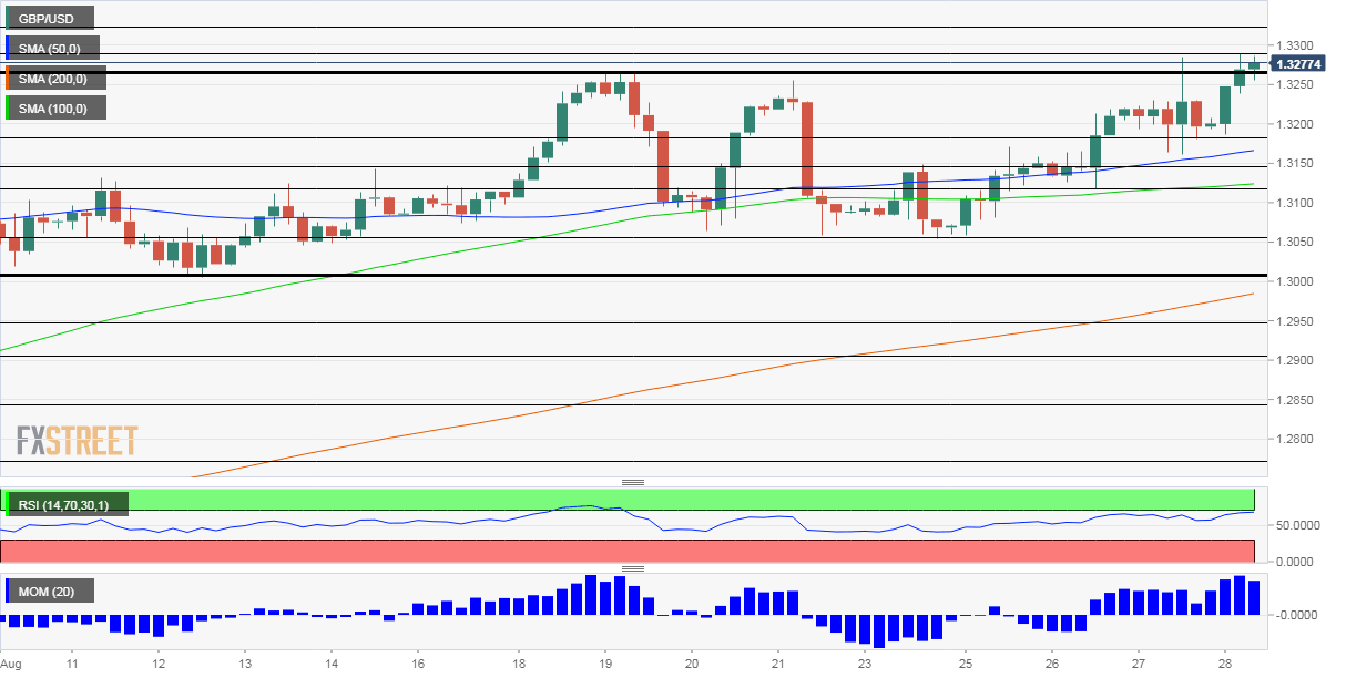 The Relative Strength Index on the four-hour chart is flirting with 70, indicating overbought conditions and countering upside momentum and the fact that cable is trading above the 50, 100, and 200 Simple Moving Averages.