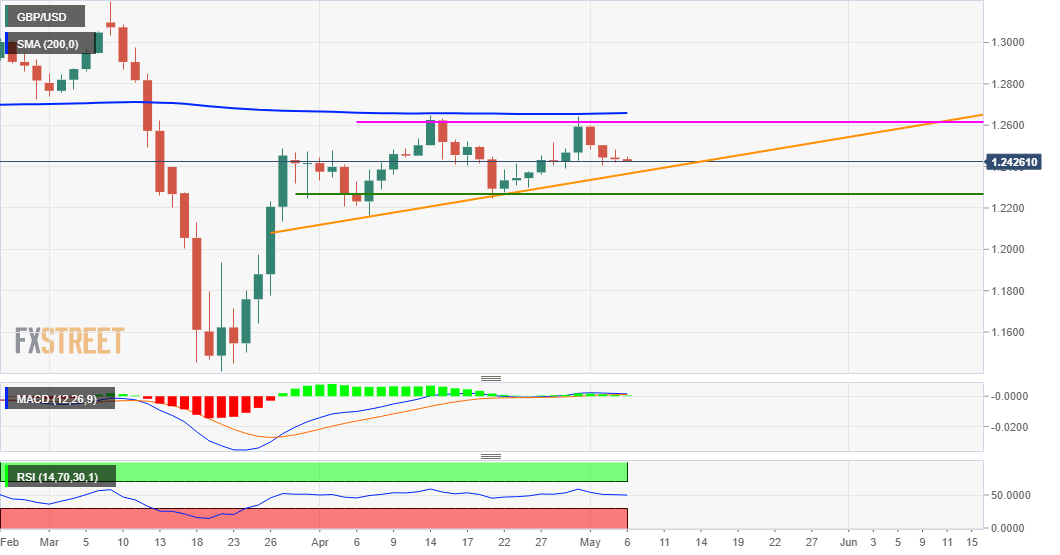 The GBP/USD pair lacked any firm intraday directional bias on Tuesday and was confined well within the previous day's broader trading range. The pair gained some traction and climbed to an intraday high level of 1.2483 after the final UK Services PMI print for April was revised higher to 13.4 from 12.2 estimated earlier. However, a sudden pick up in the US dollar demand exerted some intraday bearish pressure during the European trading session. Given that the USD strength was solely led by some heavy pressure surrounding the shared currency, the pair lacked any strong follow-through selling, rather managed to attract some dip-buying near the 1.2420 region.