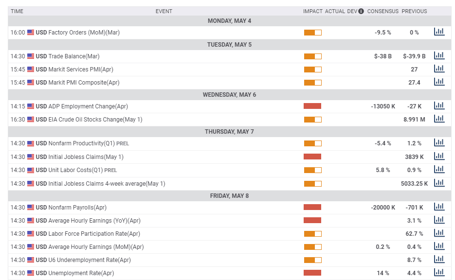 The Unemployment Rate carries expectations of jumping to 14%. It is essential to note that due to the magnitude of the pandemic, ranges vary wildly, and market reaction may be extraordinary. In general, worse numbers would weigh on stocks and boost the safe-haven dollar, but this NFP is dissimilar to any previous one.