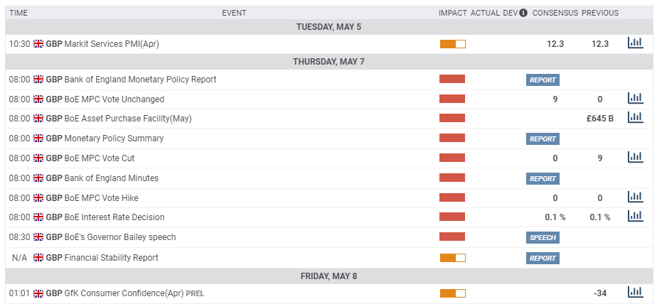 The "Old Lady," as the institution is also known, will likely leave its interest rate unchanged at 0.10% and the Quantitative Easing program at £645 billion. The BOE previously expanded slashed its rates twice and boosted its QE program by around 50% in response to the crisis .Similar to other central banks, it might opt to take stock of the current situation before acting again.