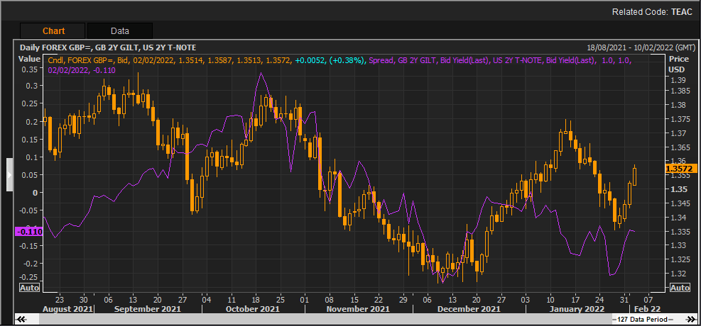 Furthermore, there is every chance that the BoE statement tries to balance a tight rope in terms of tightening policy in the near term without boxing themselves into a single policy direction. That ultimately could lead to near-term yield lower and the GBP/USD. GBP/USD has recently been closely correlated with UK and US 2 year yield spreads.