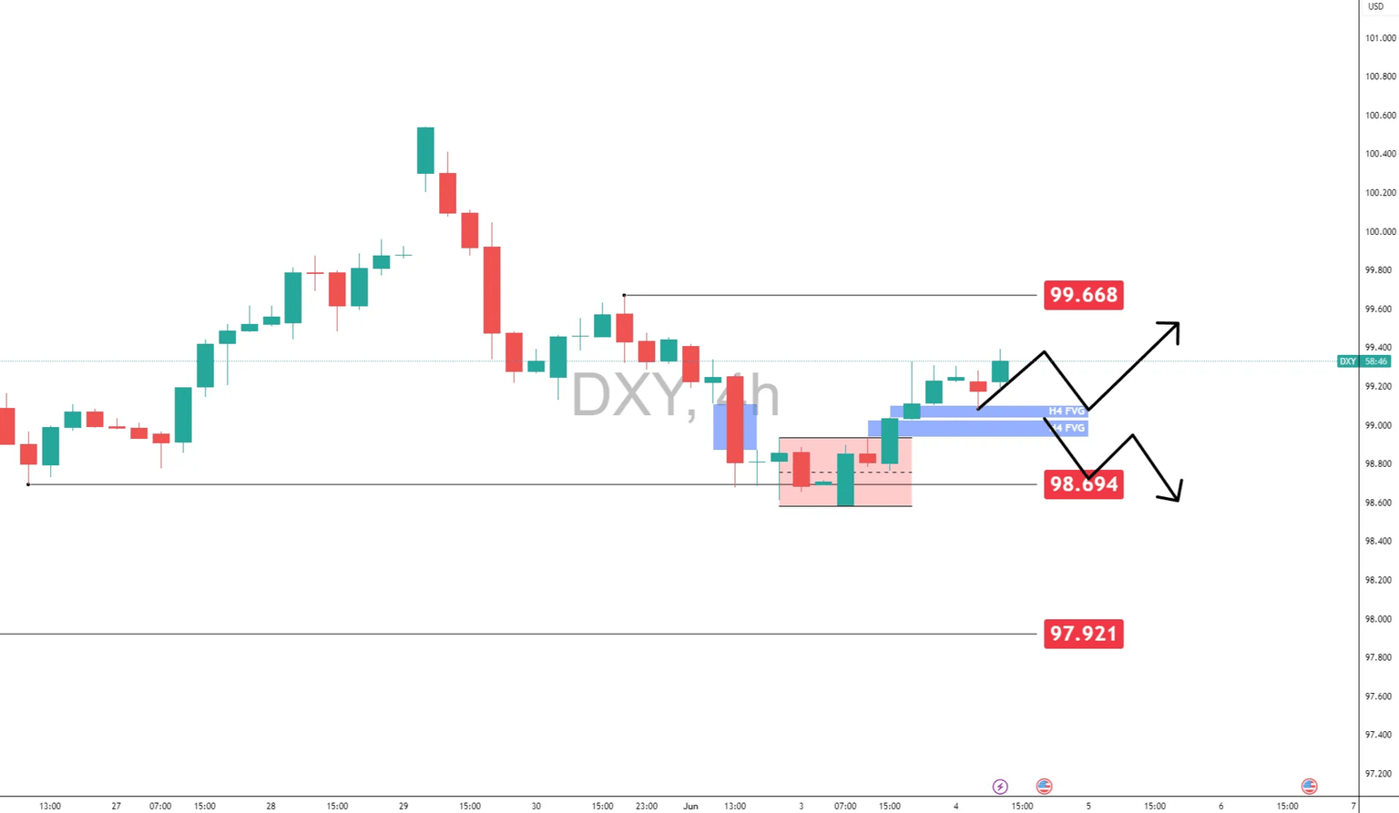 Despite recent bullish structure, the pair is showing signs of hesitation as the Dollar approaches a major resistance level at 99.668. The U.S. dollar has recovered sharply from its May lows, bouncing off the 98.700 level and invalidating a 4-hour Fair Value Gap between 99.112–98.871. Currently, USD is testing a level of potential reaction just below 99.668, with a strong impulsive move suggesting demand still favors the greenback.