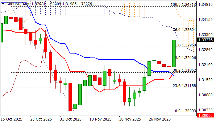 Cable hit fresh five-week high on Wednesday after being initially boosted by better than expected UK Nov services PMI, while unexpected and strong drop in US private payrolls (ADP report) added to expectations of Fed December rate cut additionally inflated sterling.