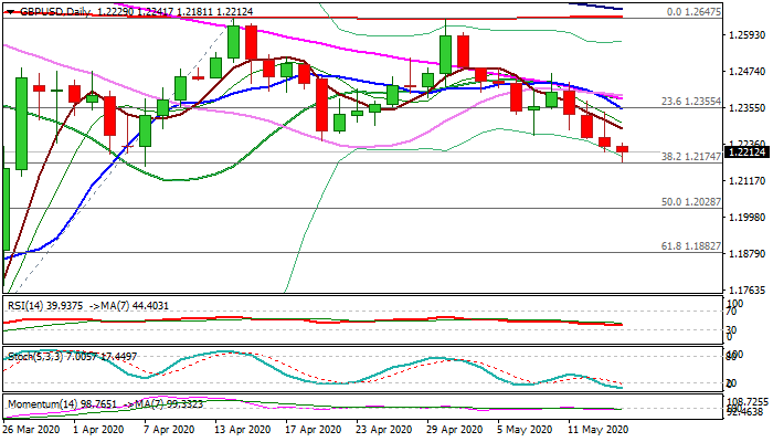 Cable probed below 1.22 handle in European trading on Thursday, extending weakness below daily cloud and pressuring key barriers at 1.2174/64 (Fibo 38.2% of 1.1409/1.2647/7 Apr low). Stronger dollar after Fed's Powell dismissed negative rates weigh on pound, already pressured by record GDP contraction and signals that BoE would increase QE next month. Daily techs in full bearish setup add to negative outlook. Firm break below 1.2174/64 pivots would generate reversal signal as it will signal an end of range trading since early April and also confirm double-top (1.2647/42) where 200DMA repeatedly capped recovery. Break lower would open way towards targets at 1.2028 (50% of 1.1409/1.2647) and 1.20 (psychological). Former low (1.2247) and falling 5DMA (1.2287) mark solid barriers which are expected to cap upticks and keep bears intact.