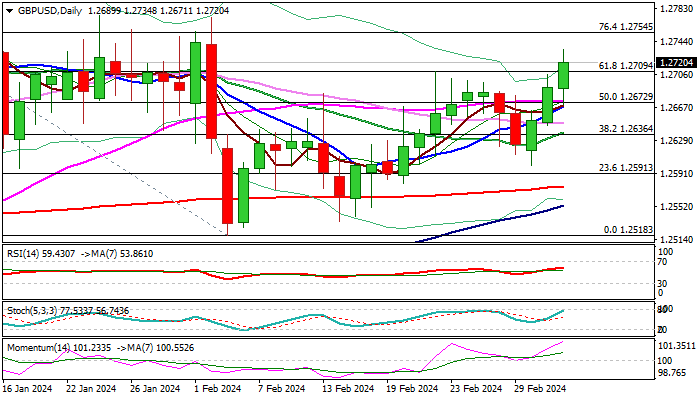 Bulls may accelerate further and risk retesting key barriers at 1.2785 (2024 high) and 1.2827 (Dec 28 peak) in dovish shift from Powell, as bets for the first rate cut in June grow, following warnings from the recent weaker than expected US economic data.
