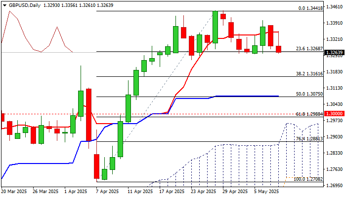 Technical picture on daily chart is expected to remain predominantly bullish while the price action holds above 1.3250 zone (floor of recent range / Fibo 23.6% retracement of 1.2708/1.3444 upleg) where several attacks were recently rejected.