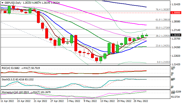 Cable keeps positive tone at the start of the week following strong rally in past two weeks (3.1%) but bulls face headwinds from falling weekly Tenkan-sen (1.2661) which capped recovery last Friday and continues to limit the action today.