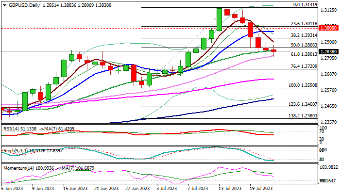 Cable edged lower in early Monday and hit new marginally lower two-week low, after bears probed through pivotal supports at 1.2866/48 (Fibo 50% of 1.2590/1.3141 / 20DMA) though losses were limited and near-term action influenced by Friday’s Doji candle, being so far in the same shape.