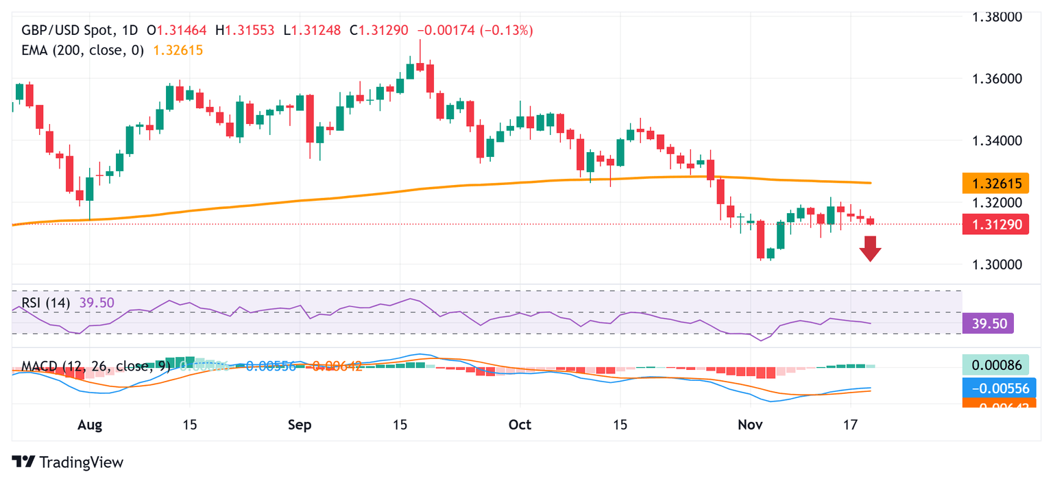 The GBP/USD pair trades with a negative bias for the fourth straight day and touches a fresh weekly low following the release of the UK consumer inflation figures this Wednesday. The UK Office for National Statistics (ONS) reported that the headline Consumer Price Index (CPI) rose 3.6% over the year in October, down from 3.8% the previous month. Adding to this, the core gauge, which excludes volatile energy and food prices, slowed from the 3.5% growth seen in September to 3.4% during the reported month. This validates the Bank of England's (BoE) view that inflation is easing and backs the case for an interest rate cut in December, which acts as a headwind for the British Pound (GBP).