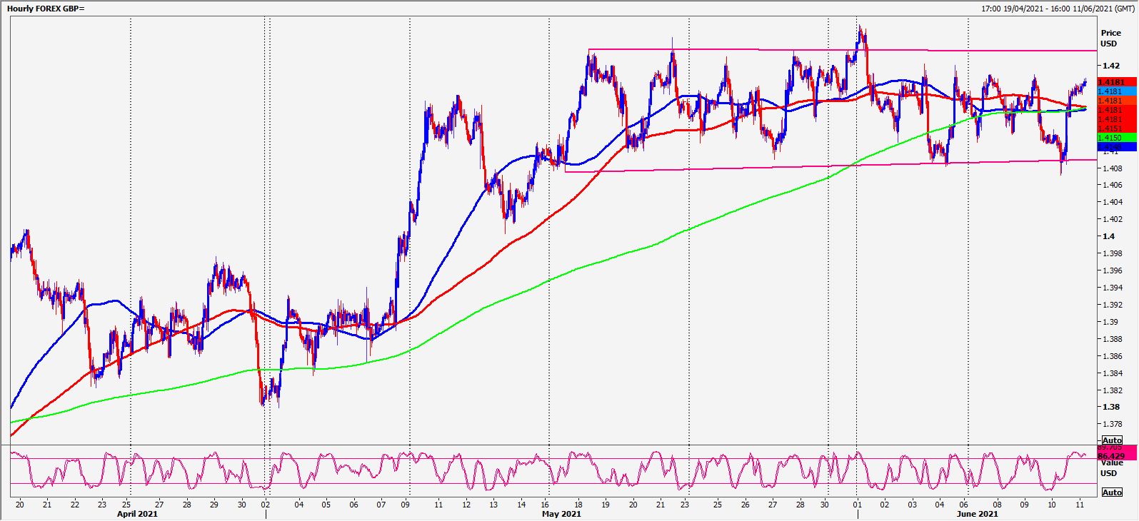 GBPUSD in a sideways consolidation for 3 weeks from 100 month moving average support at 1.4080/60 (we bottomed exactly here yesterday) up to resistance at 1.4220/40. Trade this range while we wait for a breakout.
