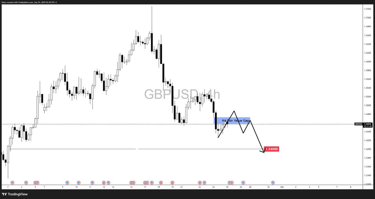 Failure to clear the 1.34575–1.34732 FVG would likely reinforce bearish momentum. In this case, sellers may drive price back down toward 1.3400, the next key support and liquidity target. A breakdown below 1.3400 would open the door to a deeper slide, potentially testing the 1.3300 handle in the coming sessions.