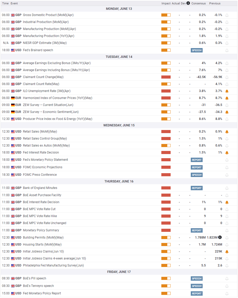 After finishing the week in negative territory, GBP/USD is looking forward to the Fed and BOE monetary policy decisions in the week ahead for the next directional bias. Mounting tensions over a looming recession and higher inflation dominated financial markets and favored the safe-haven US dollar throughout the week. Meanwhile, UK political jitters and dire economic outlook weighed on the pound.