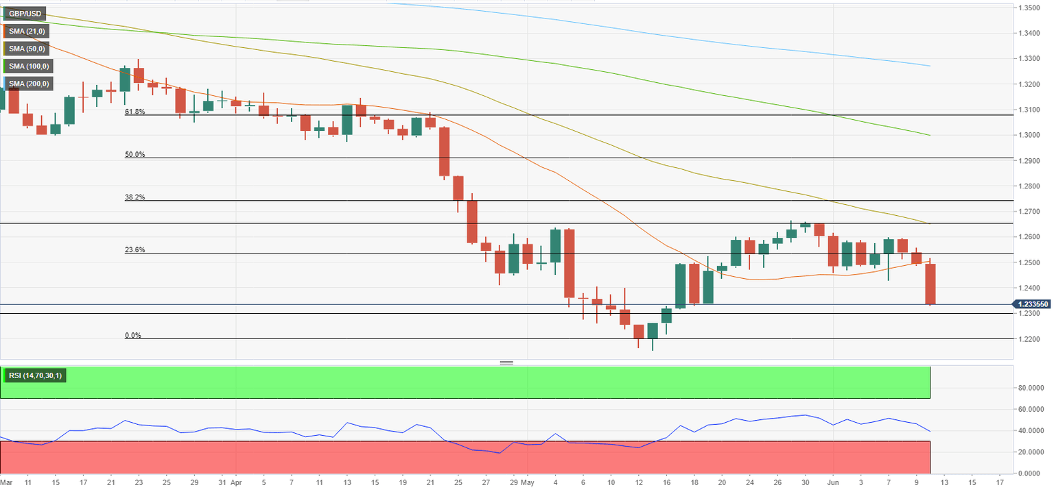 On the downside, 1.2300 (psychological level) aligns as initial support. With a daily close below that level, GBP/USD could extend its slide toward 1.2200 (static level, the end-point of the downtrend that started in late March) and touch a fresh two-year low at 1.2150.