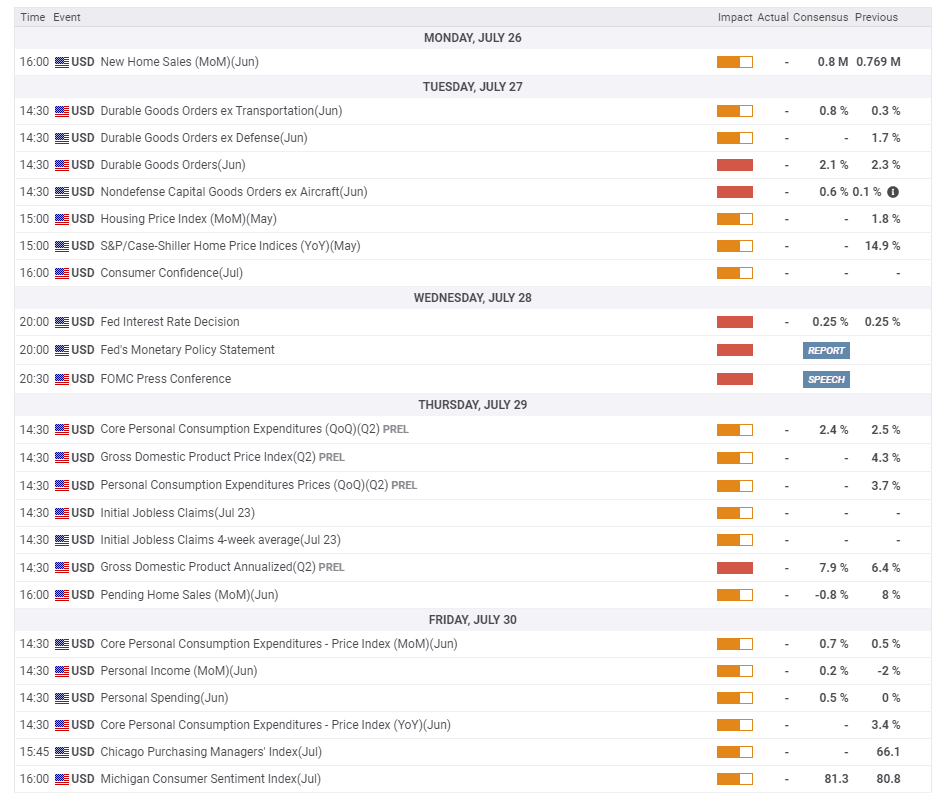 Apart from the Fed decision, top-tier figures are due out. Durable Goods Orders for June are forecast to show an increase in investment, and the data will help shape expectations for Gross Domestic Product figures released on Thursday.