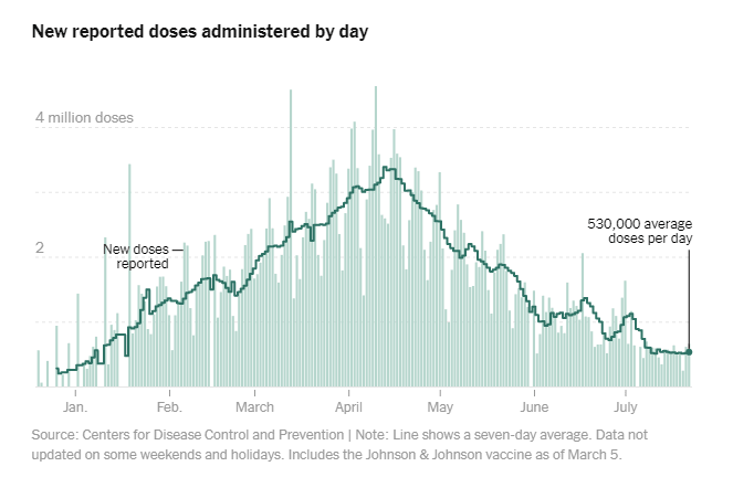 While Britain's decision to reopen the economy came as over half the population is fully vaccinated, America's take-up has stalled below that level. The pace of immunization is just above 500,000 – a rate last seen in January.