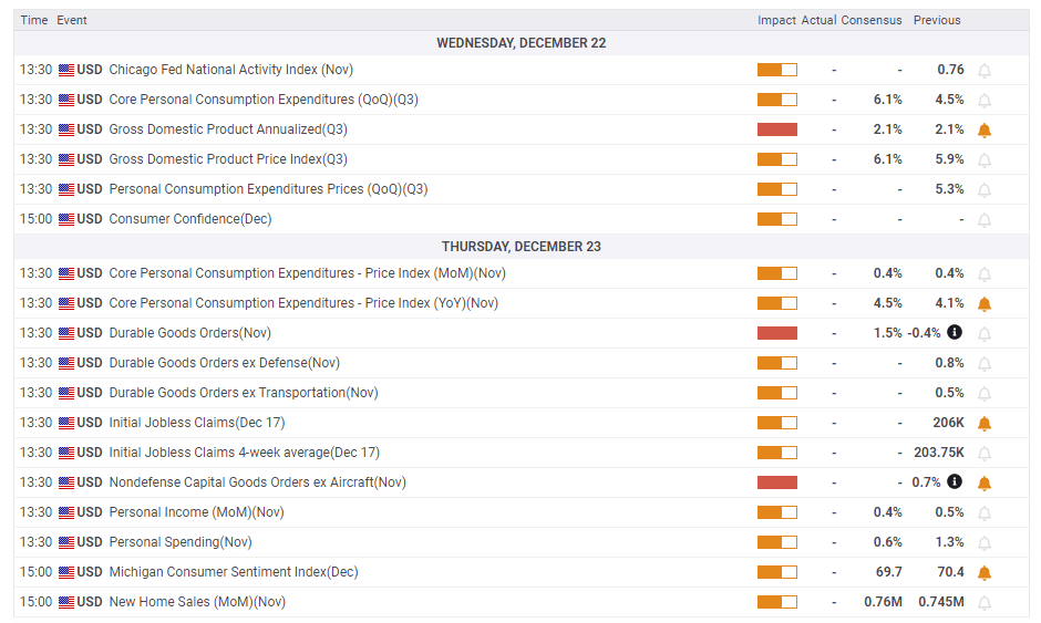 Another market-moving release is Core PCE – the Fed's preferred inflation gauge. It already hit 4.1% in October, double the bank's target and a 4.5% print is on the cards for November. Personal Income, Personal Spending, New Home Sales, and weekly jobless claims are all of interest.