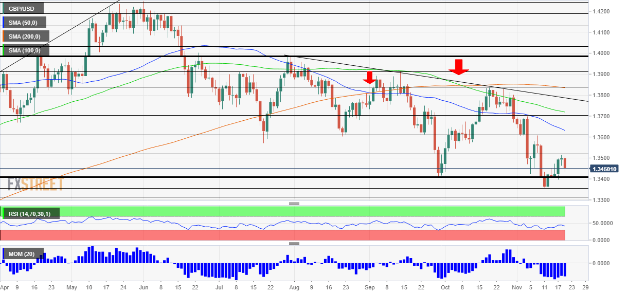 Support awaits at 1.34, late September's tough. It is followed by November's low point of 1.330, and then by 1.3310, a cushion from late 2020.