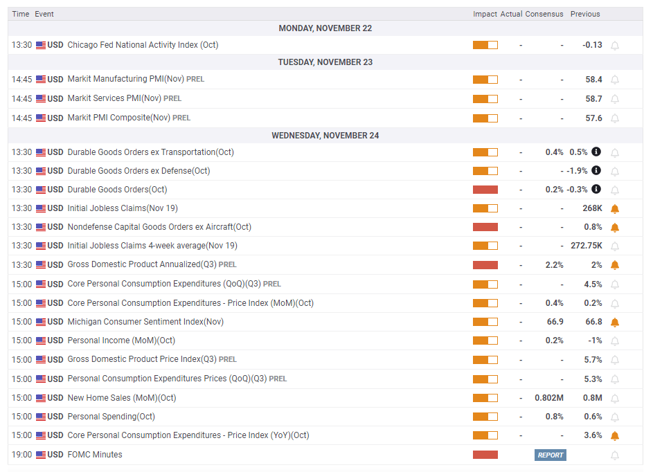 The economic calendar is lighter, but there are several noteworthy events. Preliminary Purhcasing Managers' Indexes for November will likely remain high, pointing to ongoing expansion, despite supply chain issues. Any retreat from the highs could weigh on the pound.