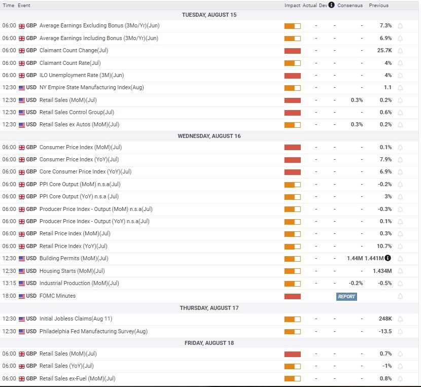 On Wednesday, the UK will release the July inflation report, including the Consumer Price Index (CPI) and the Producer Price Index (PPI). The CPI is expected to show a significant decline in the annual rate from 7.9% to 7%, with the Core CPI rate falling marginally from 6.9% to 6.8%. Inflation figures will be closely scrutinized. An acceleration in inflation would be seen as a surprise and could boost the Pound. However, if the numbers come below expectations, it may not necessarily harm the Pound, as it could improve the economic outlook. Another important report in the UK will be the July Retail Sales, to be released on Friday.