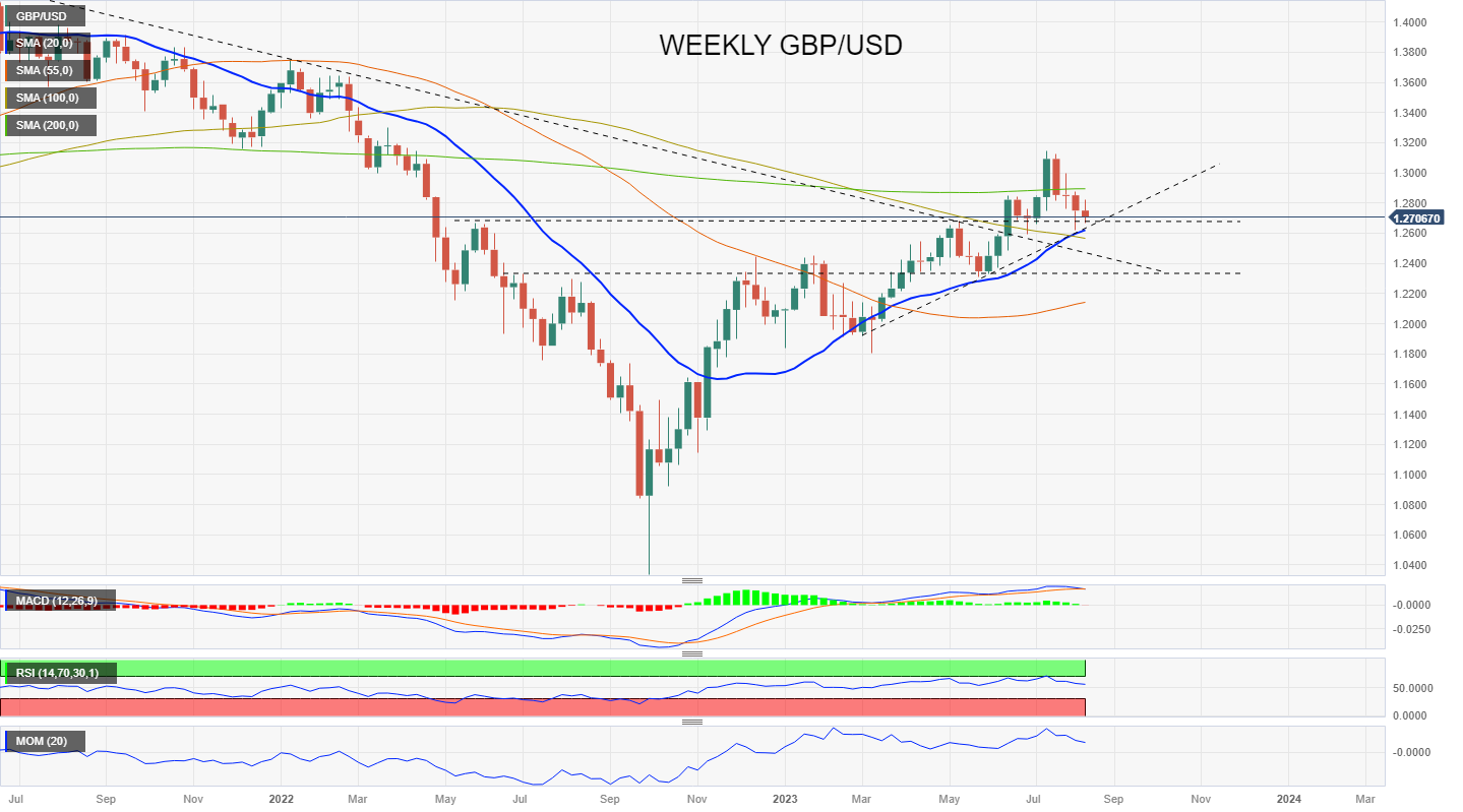 The weekly chart shows some positive signs despite presenting the fourth consecutive weekly decline. The pair remains above a trendline and the important 20-week Simple Moving Average (SMA) around 1.2620. However, technical indicators suggest that bearish risks are increasing, with the Relative Strength Index (RSI) heading south and Momentum about to drop below 100. The Pound needs to hold above the mentioned SMA to limit losses. If it fails to do so, it could trigger an acceleration to the downside. On the contrary, if the Pound holds above, it could stage a recovery with critical resistance seen at the 1.2860 – 1.2880 area.