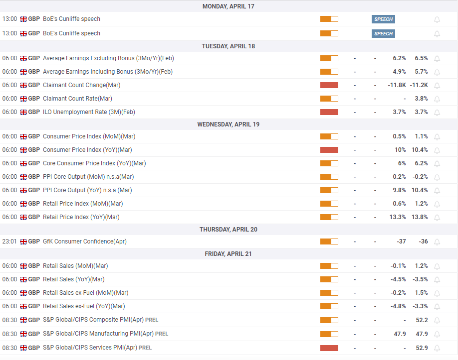 The data from the US revealed on Friday that Retail Sales contracted by 1% on a monthly basis in March, compared to the market expectation for a decrease of 0.4%. The Fed reported a 0.4% growth in Industrial Production in March. In the meantime, Federal Reserve Governor Christopher Waller said that the monetary policy will need to remain tight for a substantial period and “longer than markets anticipate.” The comments helped the USD erase some of its weekly losses and caused GBP/USD to decline below 1.2500. Ahead of the weekend, the University of Michigan said that the Consumer Confidence Index improved slightly to 63.5 in early April from 62 in March. More importantly, the year-ahead inflation expectation component of the survey rose to 4.6% from 3.6%.