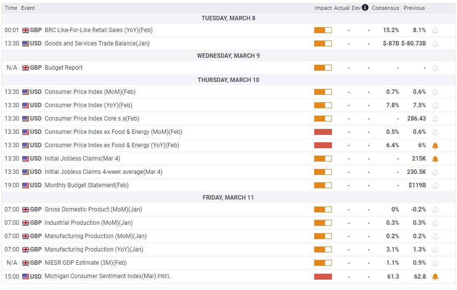 Russia-Ukraine war-related developments will continue to emerge as the key risk factors next week, with a cease-fire unlikely to be seen as a principal outcome should peace talks extend. Investors will also remain wary of oil price action and any significant impact on the Bank of England’s (BOE) monetary policy expectations.