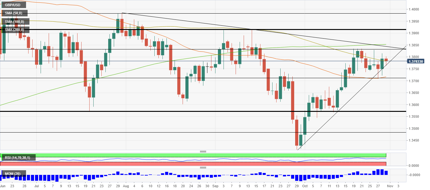 Resistance awaits at 1.3825, which capped cable several times in the second half of October. It is followed by the powerful double-top of 1.3915. Further above, 1.3975 and 1.4030 are eyed.