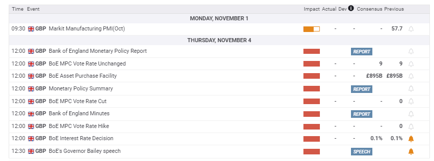 BOE Governor Andrew Bailey could use the opportunity to hint about future increases to borrowing costs, coming either in December or in the following MPR publication due in February. Higher inflation – a result of global issues and Brexit – alongside projected higher government spending may embolden the hawks.