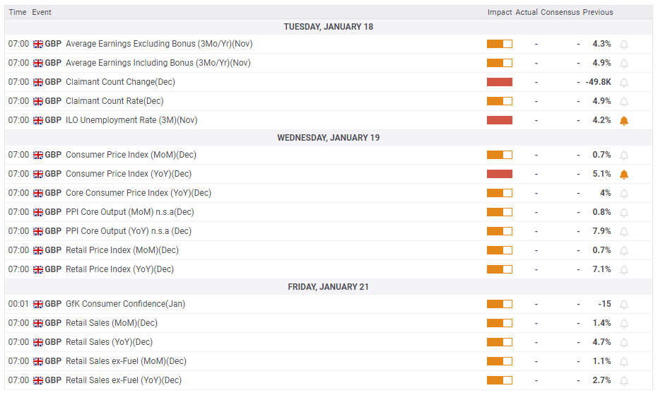 The most significant release of the week is due on Wednesday, with the inflation report. The headline Consumer Price Index is set to edge up from November's 5.1% YoY figure but remain far from America's 7% level. The Bank of England already raised rates in December, and a more significant increase in inflation would cement another move in February. A surprising sub-5% figure would send sterling down.